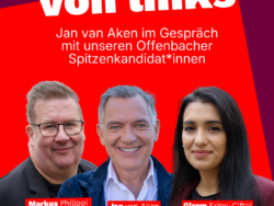 Am Samstag, den 31. Januar 2026, läutet Die Linke Offenbach die heiße Phase des Kommunalwahlkampfs ein. Unter dem Titel „Offenbach von links“ diskutieren der Bundesvorsitzende der Linken, Jan van Aken, gemeinsam mit dem Offenbacher Spitzenkandidatenduo Gizem Erinç-Çiftçi und Markus Philippi über die Zukunft der Stadt. Die Veranstaltung findet von 16:00 bis 18:00 Uhr in den Parkside Weiterlesen …