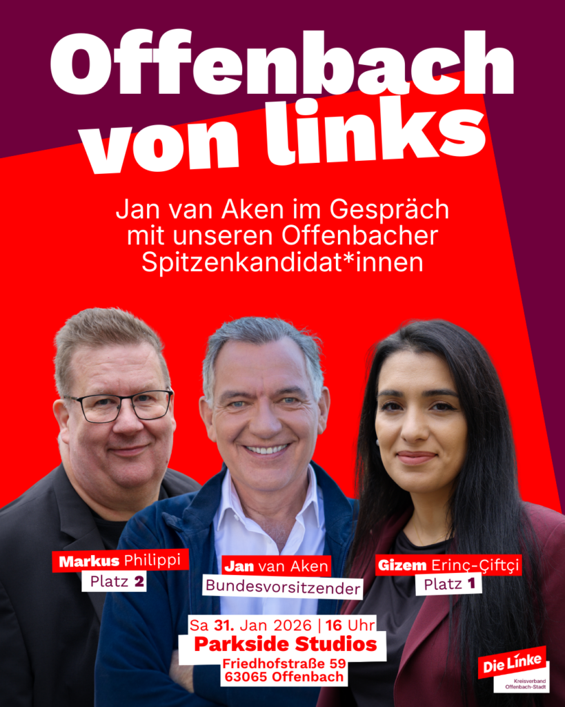 Am Samstag, den 31. Januar 2026, läutet Die Linke Offenbach die heiße Phase des Kommunalwahlkampfs ein. Unter dem Titel „Offenbach von links“ diskutieren der Bundesvorsitzende der Linken, Jan van Aken, gemeinsam mit dem Offenbacher Spitzenkandidatenduo Gizem Erinç-Çiftçi und Markus Philippi über die Zukunft der Stadt. Die Veranstaltung findet von 16:00 bis 18:00 Uhr in den Parkside Studios (Friedhofstraße 59, 63065 Offenbach) statt.