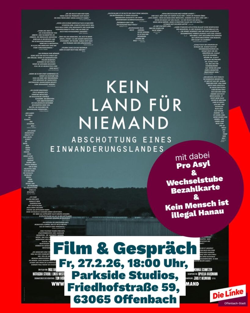 Die Linke Offenbach zeigt am 27.02.2026, um 18 Uhr, den Dokumentarfilm „Kein Land für Niemand – Abschottung eines Einwanderungslandes“ in den Parkside Studios, Friedhofstraße 59, 63065 Offenbach. Der Dokumentarfilm beleuchtet die drastischen Folgen der europäischen Abschottungspolitik und begleitet einen Rettungseinsatz im Mittelmeer, zeigt die katastrophalen Zustände in Lagern für Geflüchtete und lässt Menschen zu Wort kommen, die die lebensgefährliche Flucht nach Europa überlebt haben. Gleichzeitig blickt der Film auf Entwicklungen in Deutschland, wo Politiker*innen rechte Positionen normalisieren und Migration kriminalisieren.